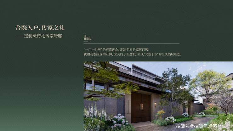 项目的设计融入了吴中的书院文化基因,采用苏式园林手法,打造出一个让人向往自然山水的低密社区。不管是自住还是作为苏州湖居资产传承,都值得拥有。社区整体采用南北分区设计,北边是湖景洋房,南边是合院别墅。进入社区要经过三重礼仪空间:首先是礼仪门厅,然后是开阔的天地院落,最后是生活雅院。在这三重空间中,还巧妙地融入了九处充满诗意的东方园林景观,营造出一种东方礼仪的归家体验。